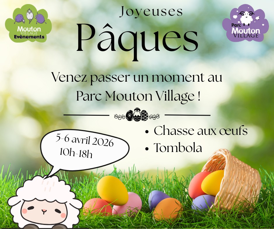 Du05avrilà06avrilDu 10:00 à 18:00 Mouton Village 21 rue du bourg neuf 79340 VaslesAjouter à mon calendrier_Animations vacances de printempsChasse aux oeufs au Parc Mouton VillageComme chaque année, Mouton Village propose aux petits et grands gourmands, une chasse aux oeufs géante dans le parc.Dimanche 05 avril et lundi 06 avril 2026 Partez à la chasse aux œufs en famille !Apportez votre panier, votre bonne humeur et ouvrez grands les yeux.....L'association Mouton Village évènements sera également présente pour vous proposer une tombola pour tenter de remplir votre panier de gourmandise!Parc ouvert de 10h à 18h (fermeture de la billetterie à 17h).Sélection de la vue© OpenStreetMap contributorsFermerPrécédentRetour à la listeSuivant