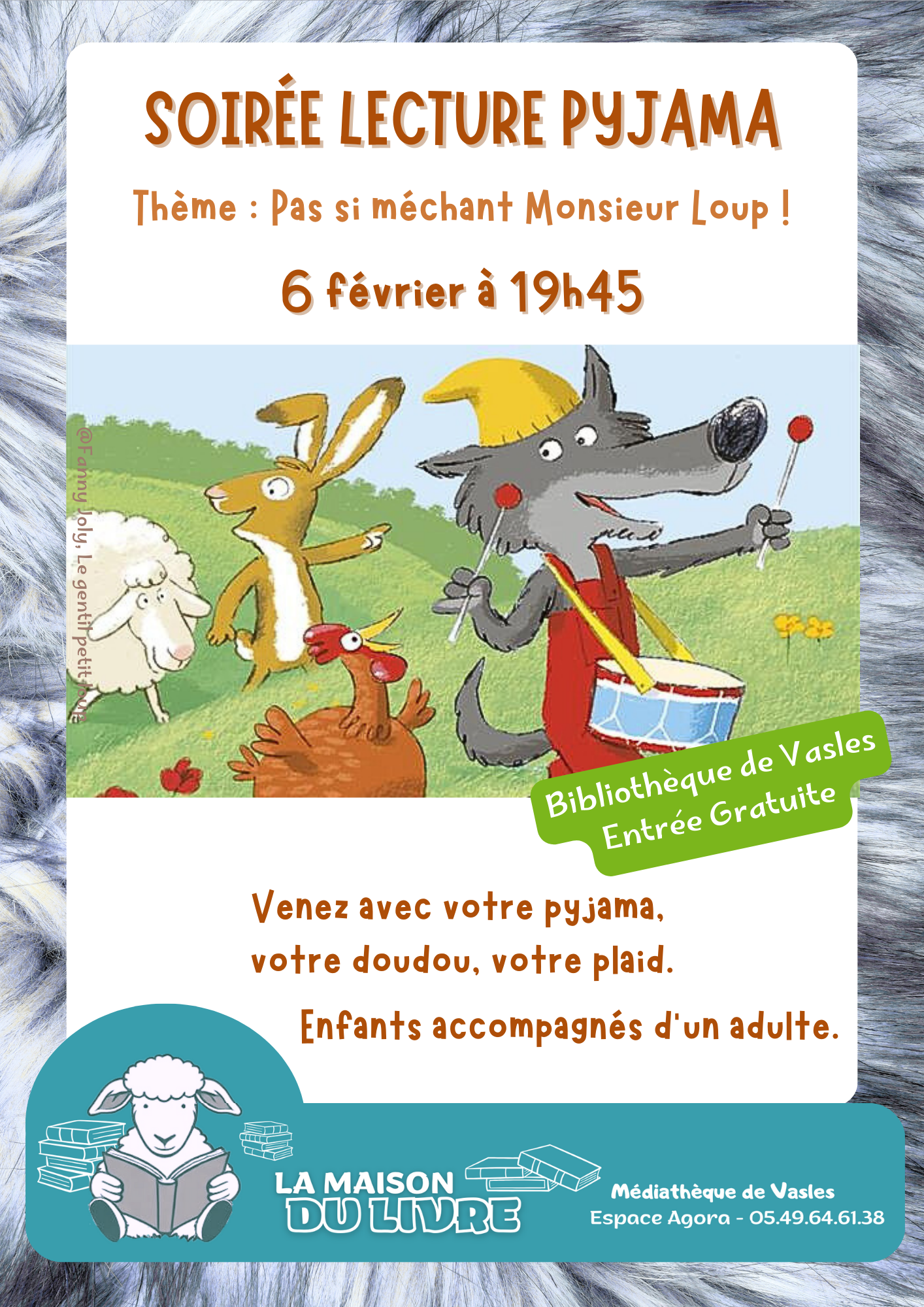Le06févr.Du 19:45 à 21:00 Bibliothèque Vasles 7 Espace Agora 79340 VASLESAjouter à mon calendrierLectureSoirée lectures pyjamaSoirée lectures pyjama sur le thème : Pas si Méchant Monsieur Loup !Entrée gratuiteSélection de la vue© OpenStreetMap contributorsFermerPrécédentRetour à la listeSuivant